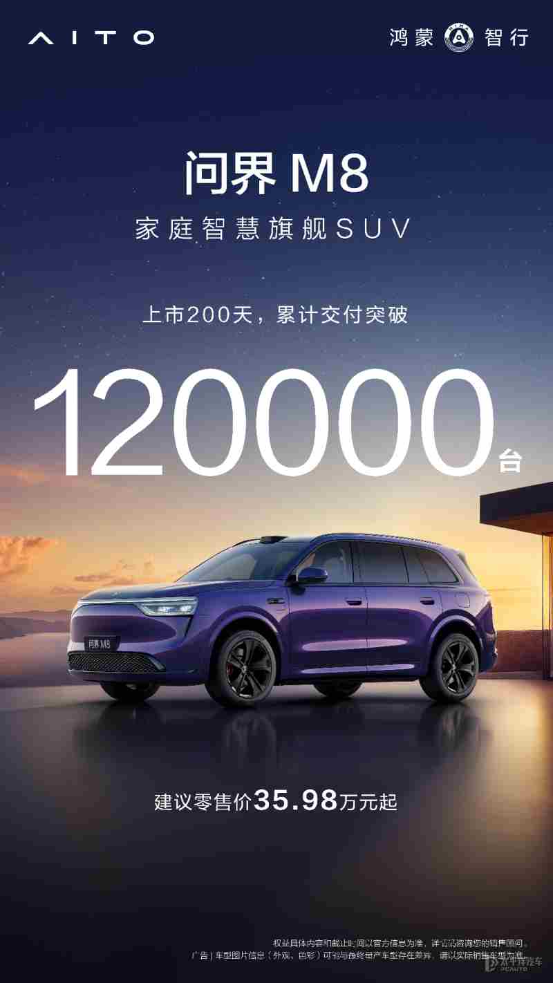 【太平洋汽车 新车频道】11月14日,从鸿蒙智行官方获悉,问界M8(询底价|查参配)自今年4月20日开始交付以来,累计交付量突破120000台,期间连续4个月销量突破2万台,蝉联大型SUV销冠。作为了解,问界M8增程版于4月16日上市;问界M8纯电版于8月25日上市,均推出6款车型,售价区间同为35.98-44.98万元。