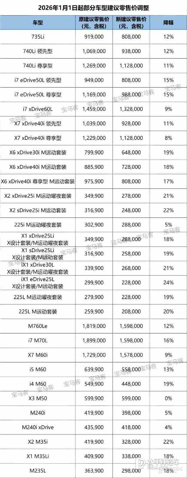 【太平洋汽车 新车频道】日前,我们从相关渠道获悉,宝马中国自2026年1月1日起对旗下31款主力车型进行建议零售价调整,其中24款车型降幅超过10%,5款车型降幅突破20%。旗舰纯电车型i7 M70L直降30.1万元,从189.9万元降至159.8万元起,成为此次降价幅度最大的车型。