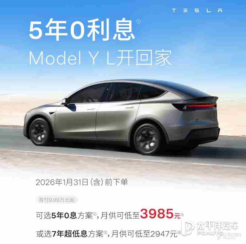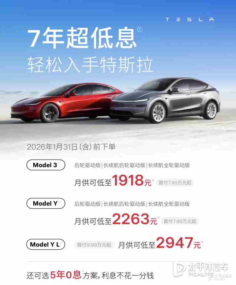 【太平洋汽车 新车频道】 1月6日,从特斯拉官方获悉,特斯拉针对旗下Model 3(询底价|查参配)、Model Y、Model Y L三款车型推出7年低息购车方案,其中Model 3/Y首付7.99万起,月供低至分别为1918元和2263元;Model Y L首付9.99万起,月供可低至2947元,不知道月薪3000-5000元的朋友们是否心动了?同时,特斯拉Model Y L首次推出5年0息购车方案,首付9.99万元,月供低至3985元。