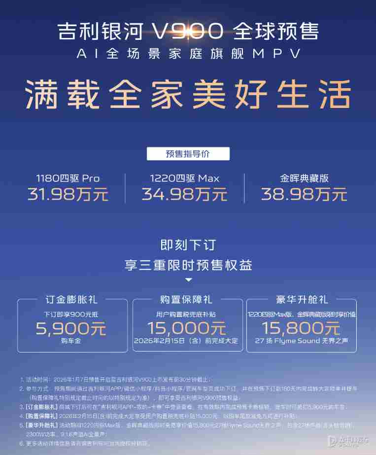 【太平洋汽车 新车频道】1月7日,吉利银河旗下中大型MPV银河V900(询底价|查参配)正式开启预售,共推出3款车型,预售区间为31.98-38.98万元。新车定位为一款中大型MPV,基于GEA Evo全球智能新能源旗舰架构打造,首次搭载吉利超级AI增程技术,主打三排平等空间体验与智能化出行场景。
