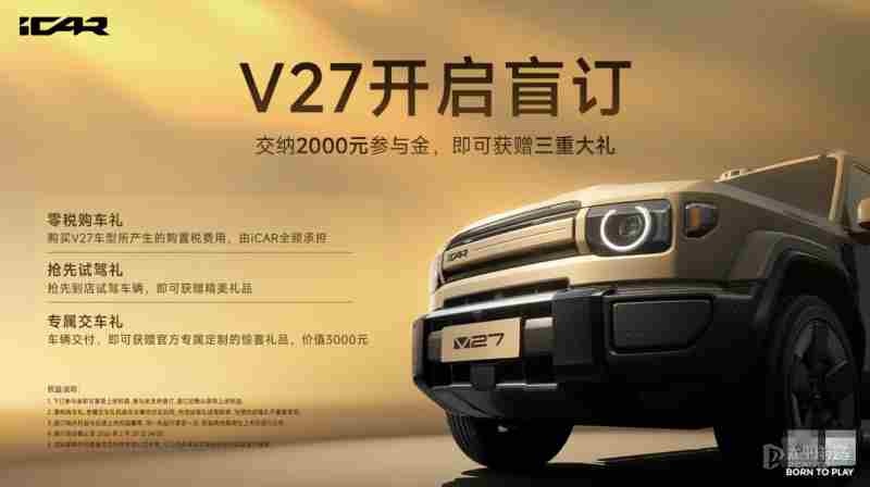 据介绍,盲订活动时间为即日起至2026年2月28日24:00,用户支付2000元参与金即可锁定三大权益:一是零税购车礼,iCAR将全额承担购买V27车型所产生的购置税费用;二是抢先试驾礼,用户抢先到店试驾可获赠精美礼品,该权益试驾即享,且不与预约试驾礼重复享受;三是专属交车礼,车辆交付时可领取官方专属定制的惊喜礼品,价值3000元。