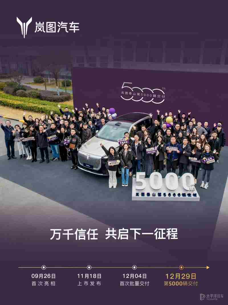 从目前市场情况来看,岚图泰山的竞争对手主要包括问界M9、腾势N9、理想L9、极氪9X等大型旗舰SUV,该车在12月共交付3154辆新车,在40万级以上SUV市场名列前茅,目前累计交付已突破5000辆。(文:太平洋汽车 吴启星)