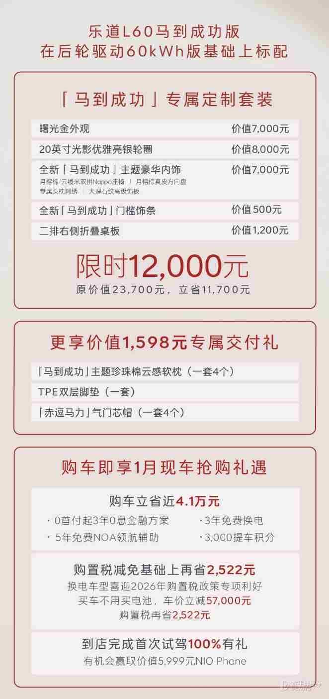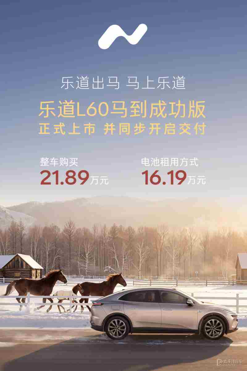 【太平洋汽车 新车频道】1月16日,乐道汽车官宣乐道L60(询底价|查参配)马到成功版正式上市并同步开启交付,整车购买方案售价21.89万元,电池租用方案售价16.19万元。