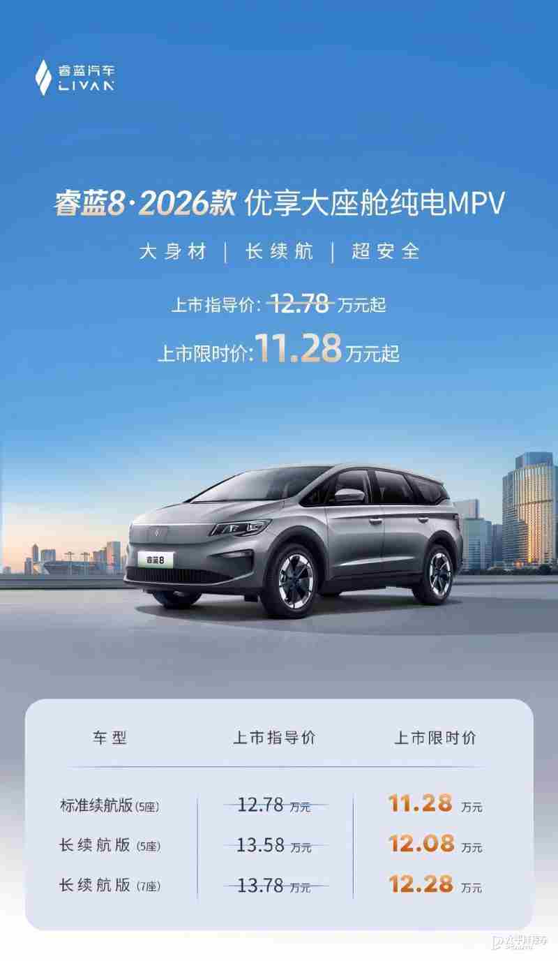 2026款睿蓝8正式上市 限时价11.28万元起 财经生活网 2026-01-10 12:12:16 【太平洋汽车 新车频道】1月16日,2026款睿蓝8(询底价|查参配)正式上市。新车推出3款配置车型,官方指导价12.78-13.78万元,限时优惠价11.28-12.28万元。新款睿蓝8定位紧凑型纯电MPV,重点升级了动力系统和续航能力,CLTC综合续航最高达545公里。