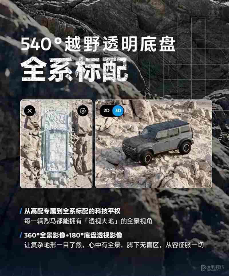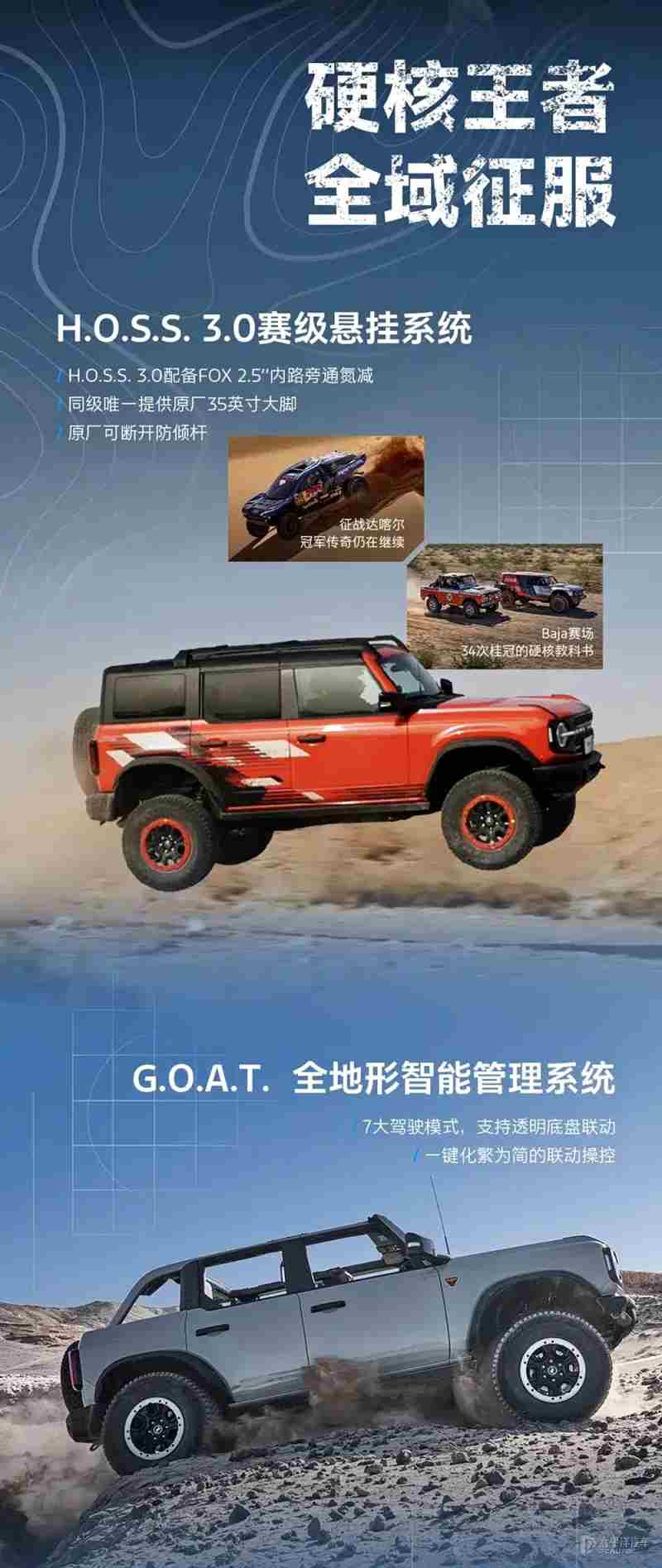 在通过性相关配置上,新车全系标配540°越野透明底盘,提供H.O.S.S. 3.0赛级悬架系统,配备FOX 2.5''内路旁通氮减,提供原厂35英寸大脚车轮和原厂可断开防倾杆。同时,新款烈马还支持G.O.A.T.全地形智能管理系统,提供7大驾驶模式,支持透明底盘联动。