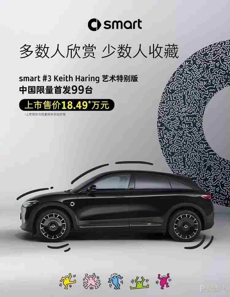 【太平洋汽车 新车频道】日前,从smart汽车官方获悉,精灵#3 Keith Haring艺术特别版正式上市,新车售价18.99万元,中国市场首发限量99台。该车由smart与街头波普艺术家Keith Haring联合打造的特别版车型,也是smart打造的第57款限量联名车型,采用特殊涂装绘制。动力上,新车基于smart #3 型动⻓续航版打造,搭载最大功率200千瓦电机,百公里加速5.4秒,CLTC纯电续航555km。