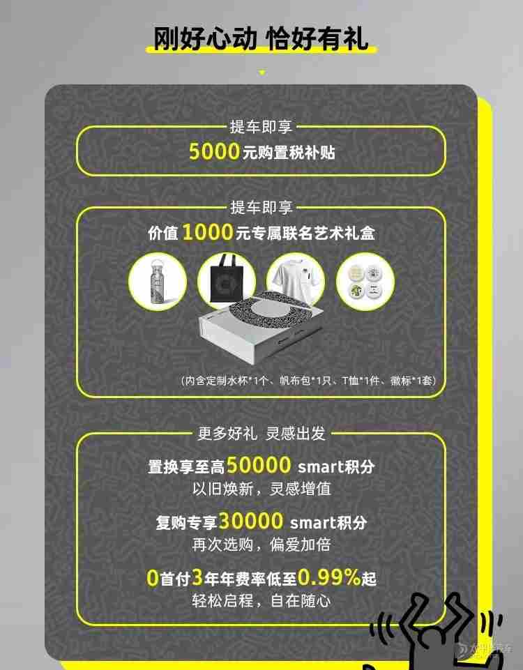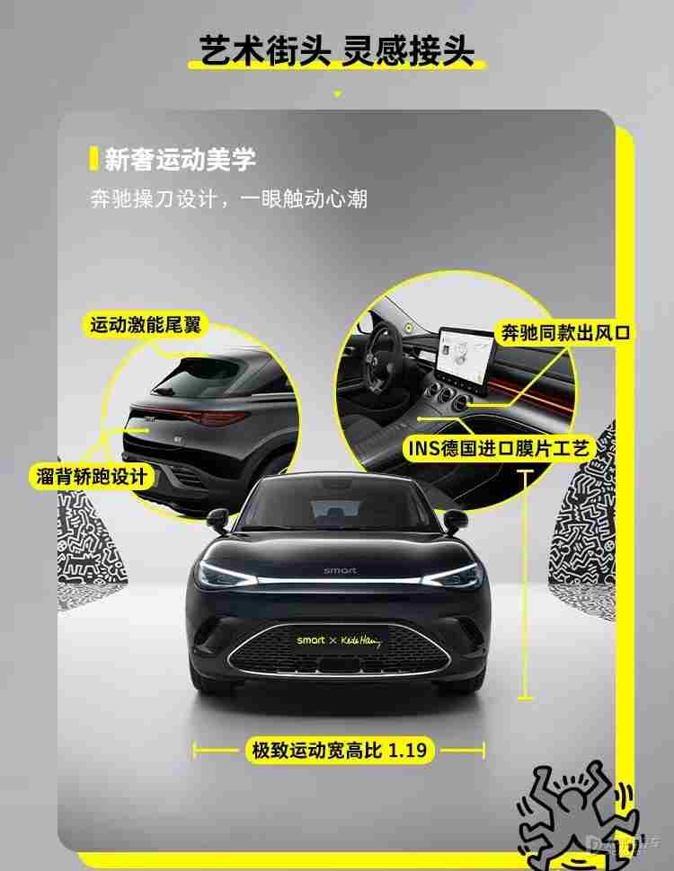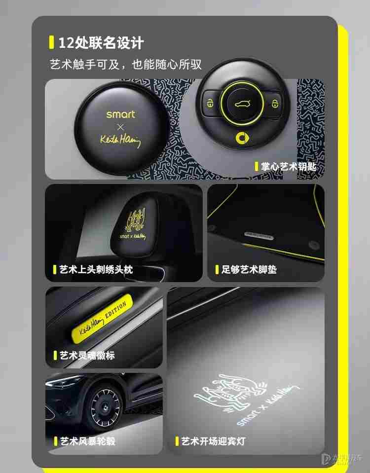 外观方面,smart精灵#3 Keith Haring艺术特别版整体延续现款车型设计,主要采用了黑色配色,同时车身多处配有smart和Keith Haring的联名标识,涵盖艺术灵魂徽标、艺术上头刺绣头枕、掌⼼艺术钥匙、⾜够艺术脚垫及解锁即亮的艺术开场迎宾灯等细节。