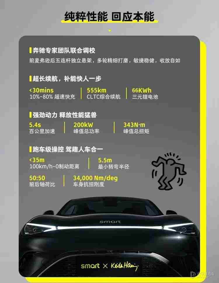 动力方面,smart精灵#3 Keith Haring艺术特别版采用单电机后驱布局,最大功率200千瓦,峰值扭矩343牛·米,百公里加速时间为5.4秒,最高车速可达180km/h,匹配容量为66千瓦时三元锂电池组,CLTC纯电续航555km,SOC 10%-80快充不到30分钟。