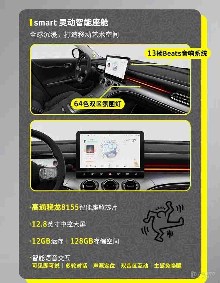内饰方面,smart精灵#3 Keith Haring艺术特别版延续现款车型设计,采用9.2英寸液晶仪表和12.8英寸悬浮式中控屏组合,搭配三辐式多功能方向盘,应用怀挡式换挡。新车座舱内置有高通骁龙8155芯片,支持4G网络、双区域语音识别唤醒、手机APP远程控制、CarPlay手机互联等功能。