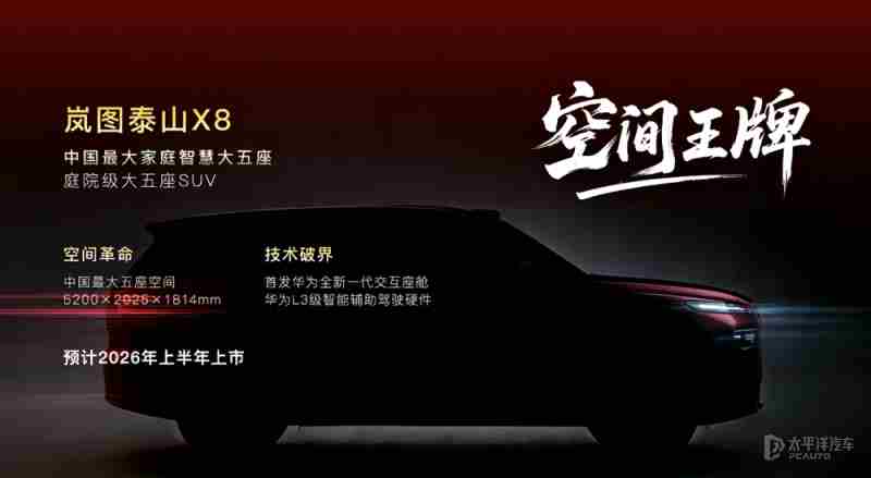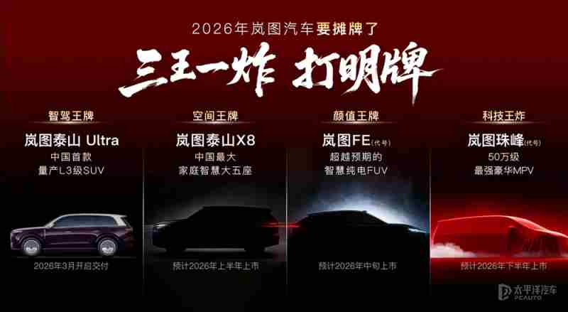 【太平洋汽车 新车频道】近日,岚图汽车透露2026年部分新车规划,品牌将推出四款全新车型,包括岚图泰山 Ultra、岚图泰山X8、岚图FE(代号)及岚图珠峰(代号),覆盖SUV、FUV及MPV三大品类。岚图泰山Ultra将于2026年3月开启交付,岚图泰山X8计划于上半年上市,岚图FE(代号)将于今年中旬上市,岚图珠峰(代号)将于下半年上市。