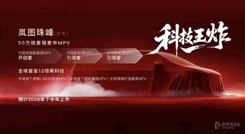 目前代号“珠峰”的MPV将首发12项新技术,搭载L3级自动驾驶,配备超级魔毯系统等。新车将于2026年下半年上市,定位来到50万级。