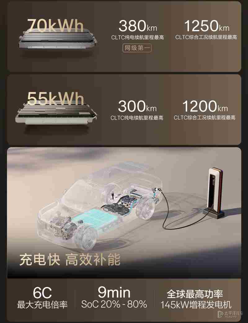 在续航方面,极氪9X提供容量55千瓦时和70千瓦时骁遥电池组可选,CLTC纯电续航分别为300km、288km、380km和355km,综合续航里程超1200km,支持最大6C充电倍率,SOC 20%-80%仅需9分钟。