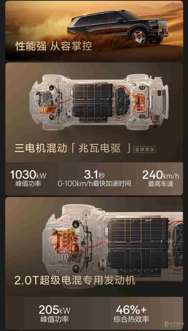 动力方面,极氪9X基于900V高压混动架构打造,全系搭载2.0T插电式混动系统,提供双电机版和三电机版可选,其中2.0T发动机最大功率205千瓦,其热效率高达46%,Max版和Ultra版前后电机最大功率分别为290千瓦和370千瓦,百公里加速3.9秒;Hyper版在前者基础上再增加最大功率370千瓦后驱动电机,电机总功率1030千瓦,百公里加速3.1秒,最高车速均为240km/h。