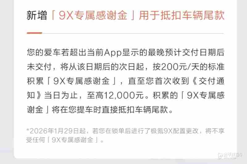 【太平洋汽车 新车频道】1月29日,从极氪汽车官方获悉,极氪9X推出专属感谢金,用于抵扣车辆尾款,若提车时间超过极氪App显示的预计交付最晚日期,极氪将按200元/天发放给用户,直至交付通知当日,至高12000元。极氪9X于9月29日完成上市,共推出4款车型,官方指导价区间为46.59-59.99万元,全系搭载2.0T插混系统,CLTC纯电续航最高380km,CLTC综合续航超1200km。