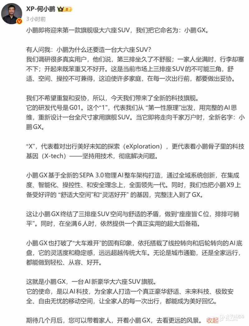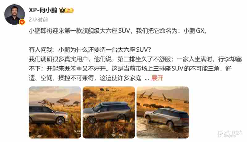 【太平洋汽车 新车频道】2月5日,小鹏汽车创始人何小鹏在社交平台正式官宣品牌首款旗舰级大六座SUV——小鹏GX,并同步发布新车官方图片。