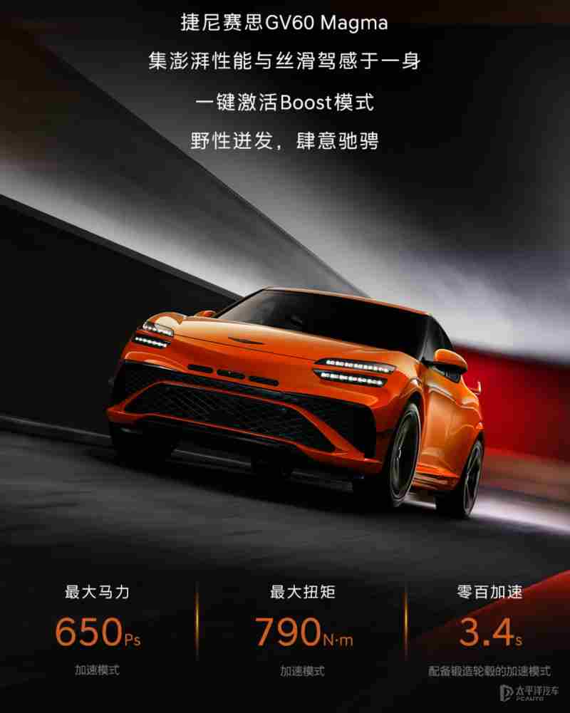 【太平洋汽车 新车频道】日前,捷尼赛思正式发布了GV60 Magma量产版的官方图片。作为捷尼赛思全新高性能子品牌Magma的首款量产车型,新车搭载双电机四驱系统,新车最大马力650Ps、最大扭矩790N·m、零百加速3.4s。