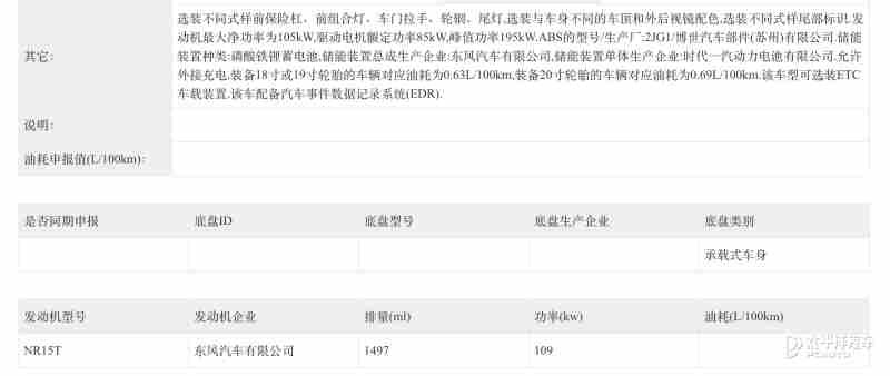 动力方面,东风日产NX8增程版搭载由NR15T增程器与驱动电机组成的插电混动系统,发动机最大净功率105kW,驱动电机峰值功率195kW;储能装置为磷酸铁锂蓄电池,支持外接充电;油耗表现上,装备18寸或19寸轮胎的车型油耗为0.63L/100km,20寸轮胎车型油耗为0.69L/100km。