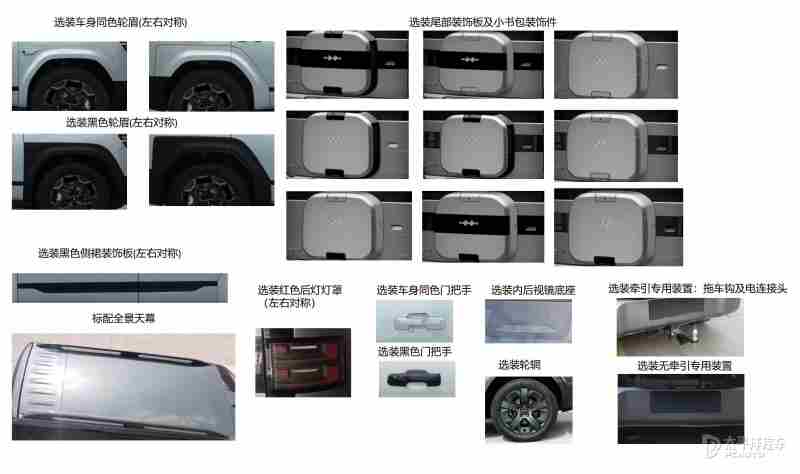 此外,新车还提供车身同色轮眉、黑色轮眉、黑色侧裙装饰板、尾部装饰板及小书包装饰件、红色后灯灯罩、车身同色门把手、黑色门把手、内后视镜底座、轮辋、拖车钩及电连接头等选装,满足用户个性化需求。